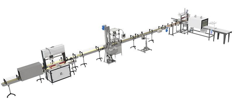 Линия розлива жидкостей без сиропа в ПЭТ-тару объемом 0,5-1,5 литров с полуавтоматическим термоупаковщиком производительностью до 3000 бут./час.