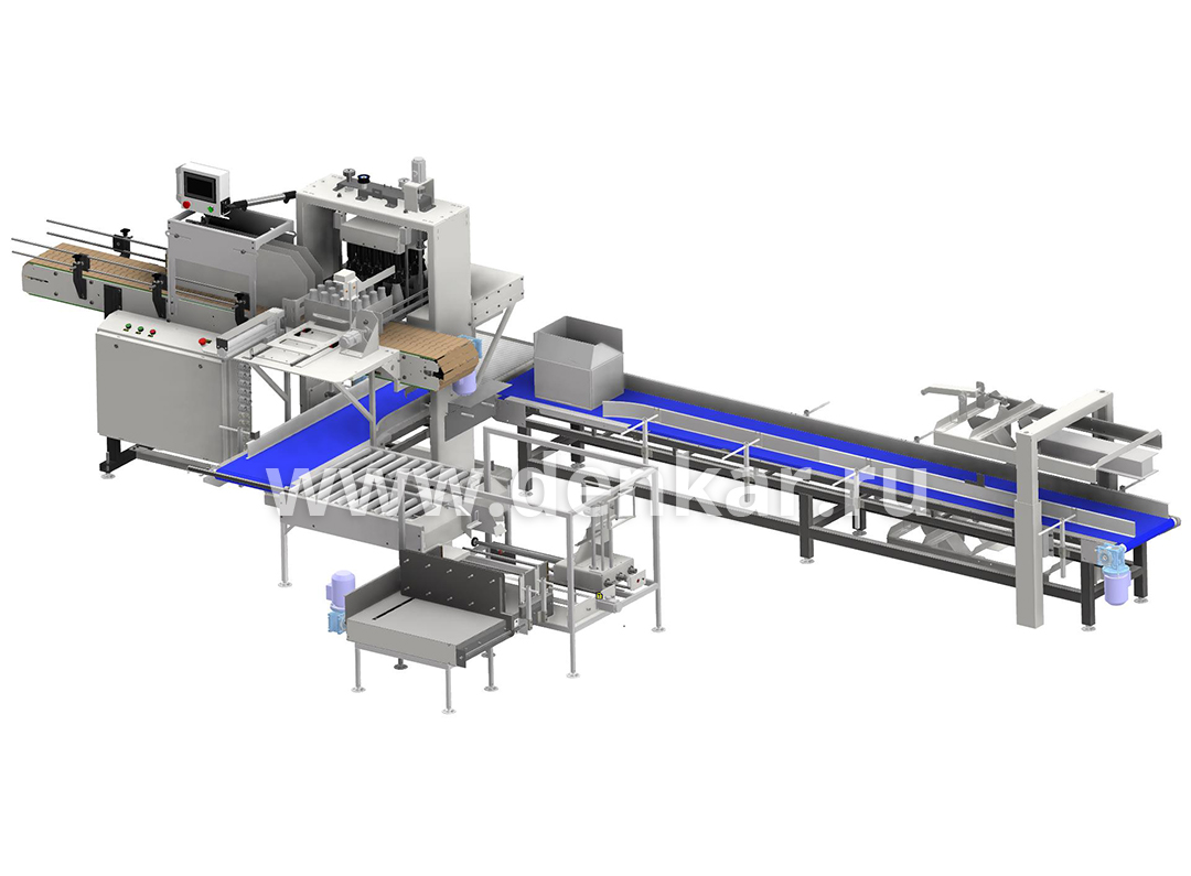 Машина оснащена механизмом автоматической заклейки короба, с загруженной в него продукцией, сверху и снизу.
