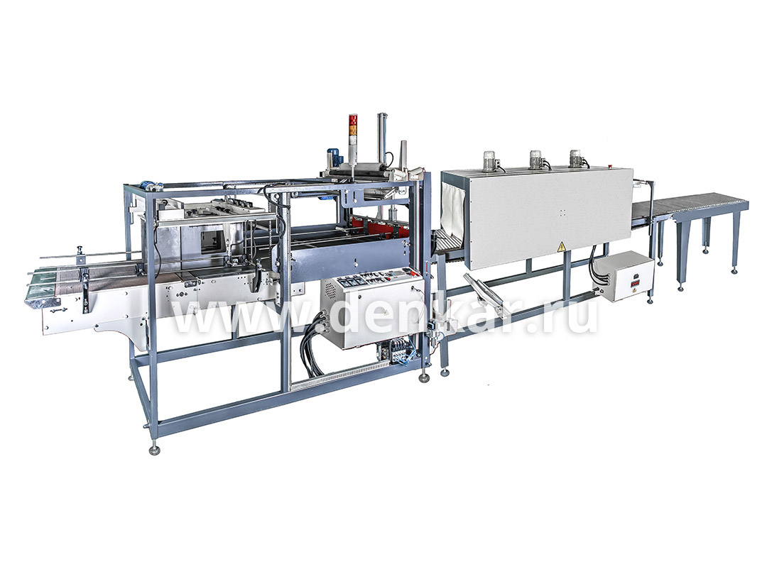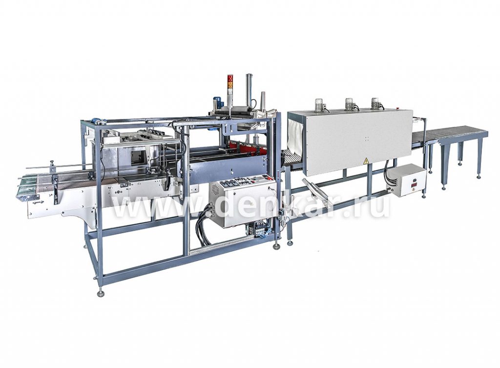 Термоупаковочная линия ТМ-1А Прямоточный предназначена для автоматической групповой упаковки в термоусадочную полиэтиленовую пленку пищевой, косметической или иной продукции в стеклянной, металлической, бумажной или пластиковой таре: банок, пэт бутылок, канистр, коробов, пакетов и т.п.