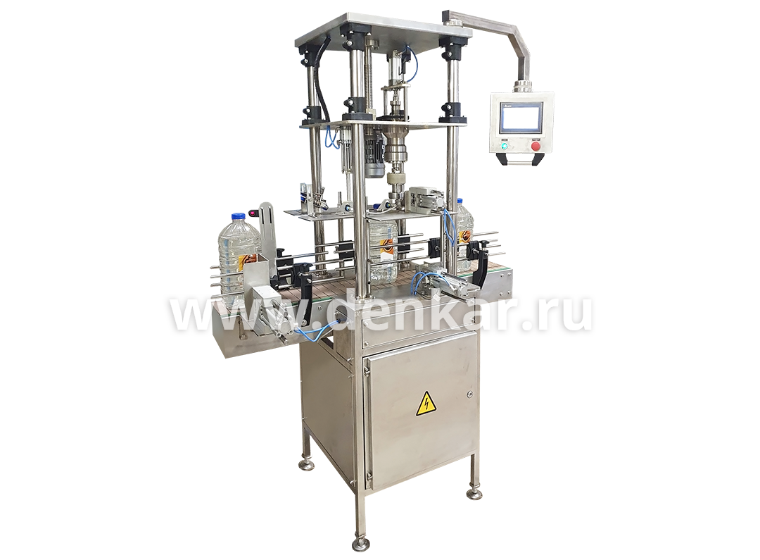 Машина предназначена для закупоривания ПЭТ бутылок (4-6 л) c винтовой пластмассовой пробкой. Укупорочная машина оснащена панелью оператора, которая используется для отображения данных о рабочих процессах и внесения корректив в работу машины через дисплей.