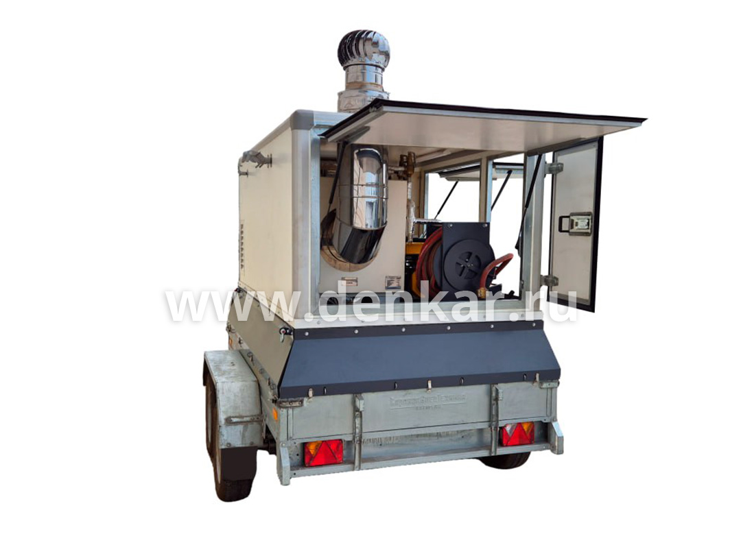 Установка выполнена на базе автомобильного прицепа и предназначена в основном для работ открытым паром, например: очистка машин и механизмов, размораживание наледи и снега, разогрев сыпучих и инертных материалов, пропаривание скважин, размораживание технологических трубопроводов, нефтепроводов и т.п.