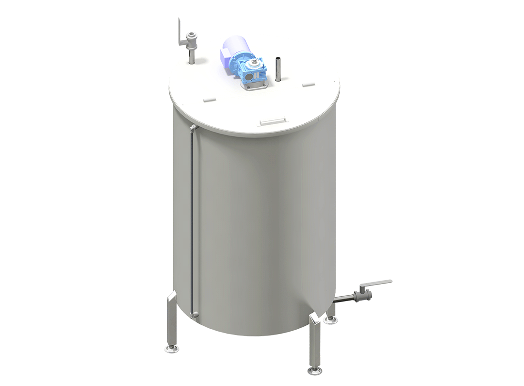 - Цилиндрический бак из пищевой нержавеющей стали (12Х18Н10Т) необходимого объема с коническим дном и плоской откидной крышкой. Бак оборудован необходимой запорной арматурой, прозрачным шлангом, для визуального контроля за уровнем, моющей головкой;