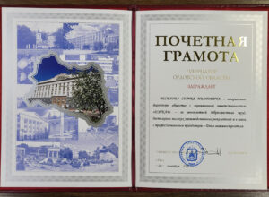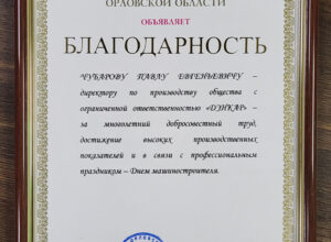 За достигнутые трудовые успехи, многолетнюю добросовестную работу, генеральный директор ООО «ДЭНКАР» Веселов Сергей Иванович награжден почетной грамотой Губернатора Орловской области, а директору по производству Чубарову Павлу Евгеньевичу так же от Губернатора Орловской области объявлена благодарность. Мы гордимся нашим производством, достигнутыми успехами, и уверены в его дальнейшем развитии и процветании.