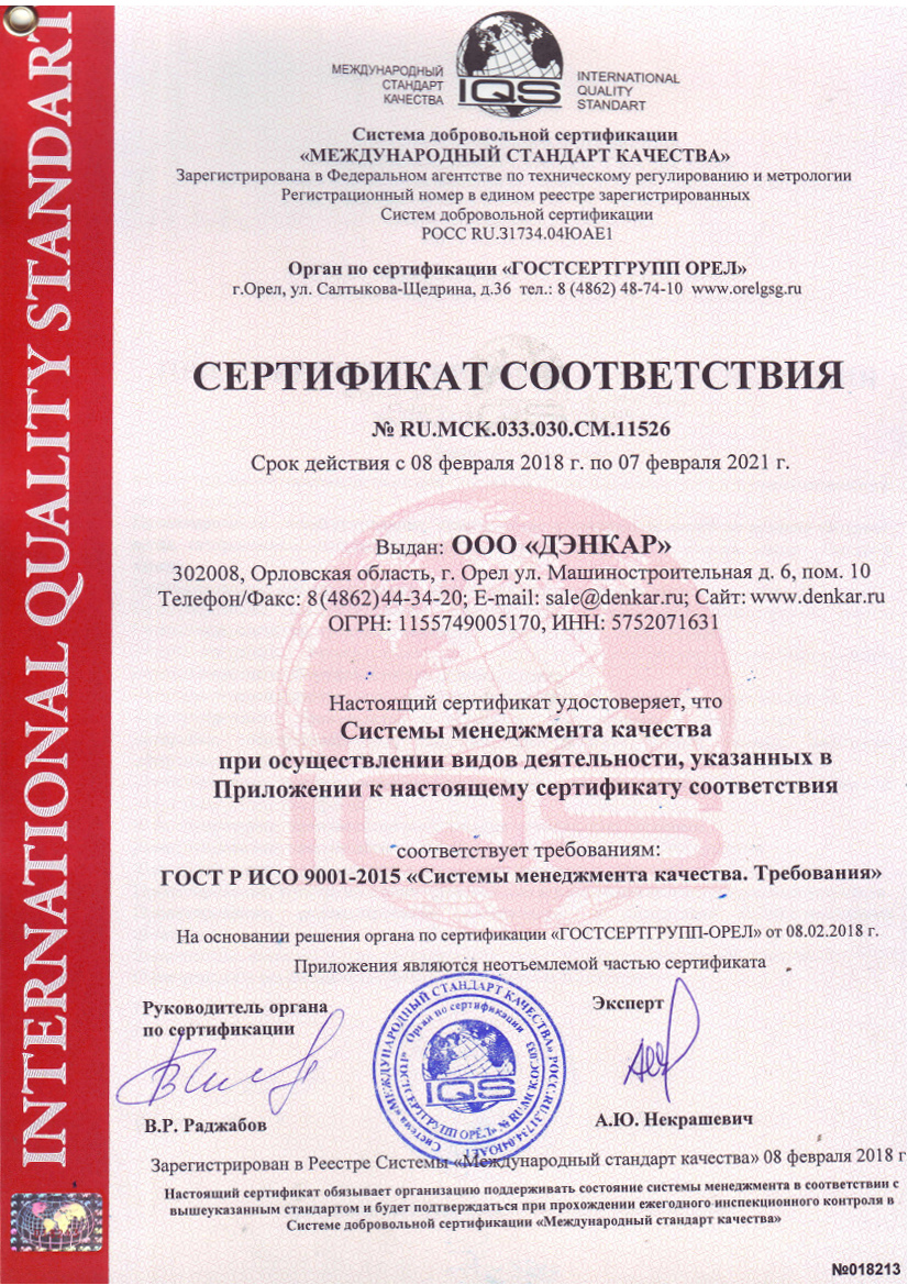 Компания «ДЭНКАР» получила Сертификат Соответствия ГОСТ Р ISO 9001-2015 «Системы менеджмента качества. Требования».