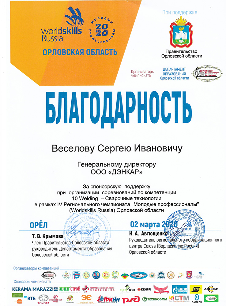 ООО «ДЭНКАР» была выражена благодарность за спонсорскую поддержку при организации соревнований по компетенции 10 Welding — Сварочные технологии в рамках IV Регионального чемпионата «Молодые профессионалы» (Worldskills Russia) Орловской области.